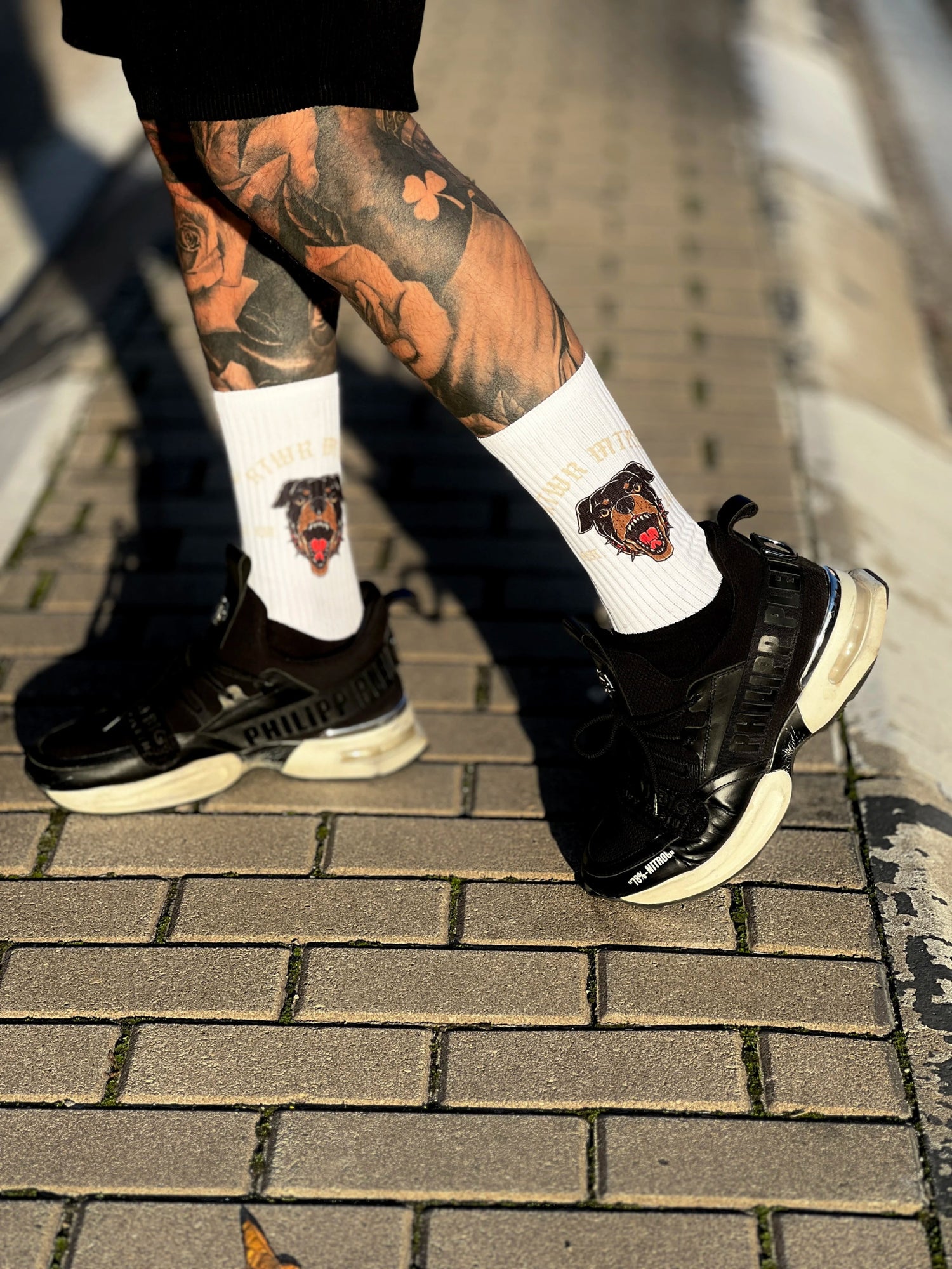 Get the unique retro vibe with our “Rotty” socks in tattoo style!